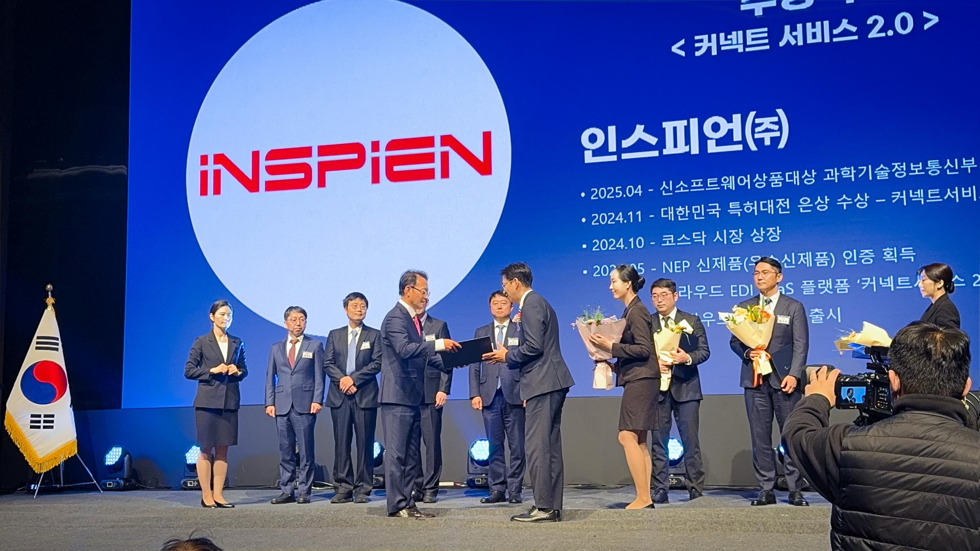 IT솔루션 전문기업 인스피언(대표 최정규, KOSDAQ:465480)이 자사의 클라우드 기반 전자문서교환(EDI) 플랫폼 ‘커넥트서비스 2.0’으로 ‘2025 대한민국 소프트웨어대상(신SW상품대상)’ 국무총리상을 수상했다고 밝혔다. 시상식은 지난 1일 서울 양재 엘타워 진행된 ‘SW산업인의 날’ 행사에서 열렸으며, 과학기술정보통신부 장관이 직접 시상에 참여했다.